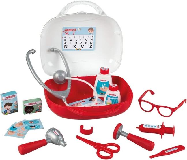 Smoby Orvosi bőrönd - piros (340104)  sok-sok orvosi eszközzel. Egy lelkiismeretes doktor bácsi vagy néni fel van készülve minden esetre, ezért táskájában megtalálhatóak a legfontosabb eszközök. Ebben a bőröndben is megtalálható a sztetoszkópot, a reflex-kalapács, lázmérő, olló, fültükör, a szemvizsgálathoz szükséges betűtábla és egy próbaszemüveg és természetesen a sebek ellátására fertőtlenítő és sebtapasz. A bőröndöt kinyitva felső részén felakasztahtó a szemvizsgálathoz használatos tábla, így a beteg már olvashatja is. A Smoby orvosi bőrönd szuper játékszer az orvosos játékokhoz!